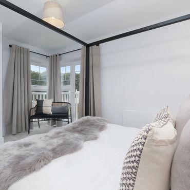The first floor is dedicated to the primary living spaces, encompassing the main lounge with a distinctive wraparound balcony and the master suite. The master bedroom is appointed with a four-poster bed, built-in wardrobes, and a private ensuite shower room.