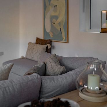 Accommodating up to six guests, the layout includes a convenient downstairs WC. The spacious lounge area features a bespoke double sofa bed and a luxurious accent chair, ideal for relaxation while enjoying the 65-inch Smart TV. The adjacent open-plan kitchen and dining area showcase a solid acacia wood table seating six to eight, complemented by a serene reading nook. The compact yet well-appointed kitchen includes a washer-dryer, dishwasher, and Nespresso machine, among other amenities.